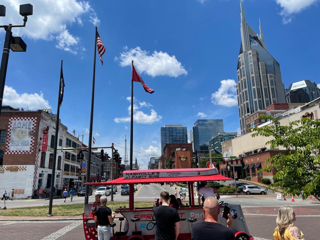 An activity that requires everyone participating to be 21 years or older is a pedal tavern or bike bar ride. I’ve seen videos on TikTok about it and it looked like a lot of fun, so naturally I booked that experience. The internet was not wrong!! It was so fun! We did the Sprocket Rocket pedal tavern tour of downtown Nashville and it was a blast! What it is, is basically a bike that has seats around a bar. There’s a bar tender and a driver (you don’t have to pedal if you don’t want to) and you can “bike” around Nashville while drinking, singing, and playing games. The driver we had told about various drinking games we could play while we pedaled around town. We were having such a good time people on the streets were actually taking pictures and videos of us as we went by which at that time we would all scream “paparazzi” and take a drink. Believe it or not it happened quite a bit and it was hilarious!